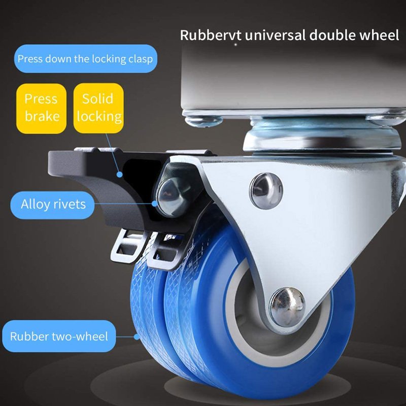Διαθέτει 4 διπλούς τροχούς με φρένα ακινητοποίησης, 8 ποδαράκια ρυθμιζόμενου ύψους και αλφάδι για την διευκόλυνση της τοποθέτησης των αντικειμένων.
