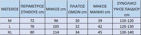 ΠΡΟΣΟΧΗ: Μετρήστε το παιδί από τον ώμο μέχρι κάτω και την περίμετρο στήθους και βρείτε το κατάλληλο μέγεθος από την παρακάτω ταμπέλα. Οι διαστάσεις στη παρακάτω ταμπέλα είναι οι πραγματικές διαστάσεις του ρούχου. Μετρώντας π.χ. το παιδί από τον ώμο μέχρι κάτω βλέπετε στη ταμπέλα ποιο μέγεθος ταιριάζει καλύτερα, δηλαδή πού θα φτάσει το ρούχο.
