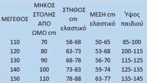 ΠΡΟΣΟΧΗ: Μετρήστε το παιδί από τον ώμο μέχρι κάτω και την περίμετρο στήθους και βρείτε το κατάλληλο μέγεθος από την παρακάτω ταμπέλα. Οι διαστάσεις στη παρακάτω ταμπέλα είναι οι πραγματικές διαστάσεις του ρούχου. Μετρώντας π.χ. το παιδί από τον ώμο μέχρι κάτω βλέπετε στη ταμπέλα ποιο μέγεθος ταιριάζει καλύτερα, δηλαδή πού θα φτάσει το ρούχο.