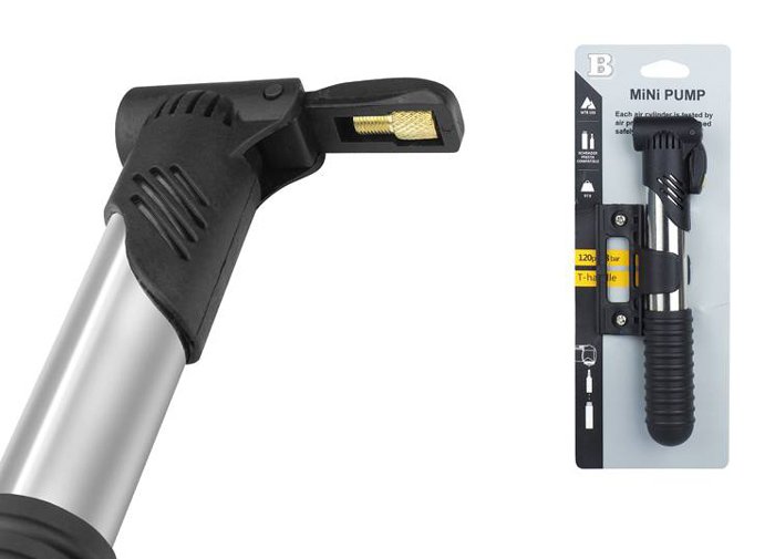 Μίνι τρόμπα χειρός με 3 ακροφύσια για το φούσκωμα των ελαστικών του ποδηλάτου σας. Το σώμα της είναι κατασκευασμένο από αλουμίνιο και ανθεκτικό πλαστικό υλικό. Στη συσκευασία συμπεριλαμβάνονται βάση και βίδες για την τοποθέτηση της στο ποδήλατο.
