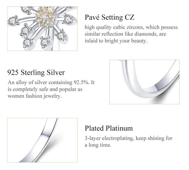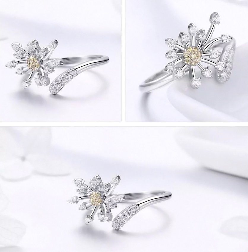 Εντυπωσιακό δαχτυλίδι, σε σχήμα dandelion, διακοσμημένο με αστραφτερή κυβική ζιρκόνια, λευκού χρώματος και χρυσού χρώματος, η οποία αντανακλά μοναδικά το φως και προσφέρει λάμψη στο κόσμημα.