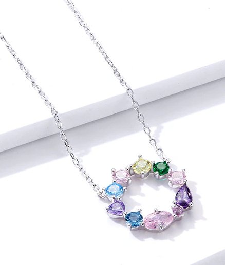 Κομψό κολιέ, διακοσμημένο με κυβική ζιρκόνια σε διάφορες κοπές και εντυπωσιακά χρώματα, η οποία προσφέρει μοναδική λάμψη στο κόσμημα και προσδίδει στυλ σε κάθε εμφάνιση.