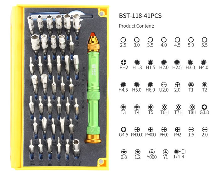 1x screwdriver set (2.5, 3.0, 3.5, 4.0, 4.5, 5.0, 5.5, PH2, H1.3, H1.5, H2.0, H2.5, H3.0, H4.0, H4.5, H5.0, H6.0, U2.0, 2.0, T1, T2, T3, T4, T5, T6H, T7H, T8H, G3.8, G4.5, PH0000, PH000, PH00, PH2, 1.5, 2.0, 0.8, 1.2, Y000, Y1, 1/4 4)