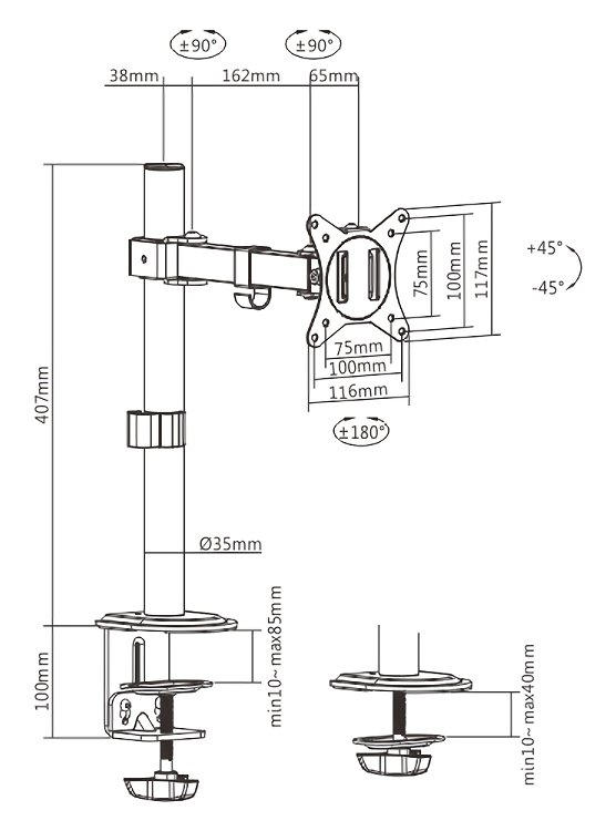 Πάχος επιφάνειας εργασίας: Clamp: 10~85mm, Grommet: 10~40mm