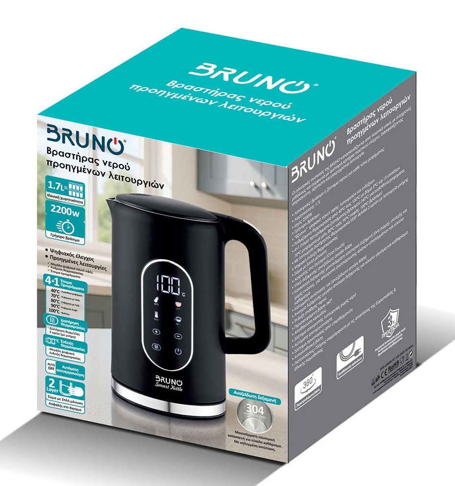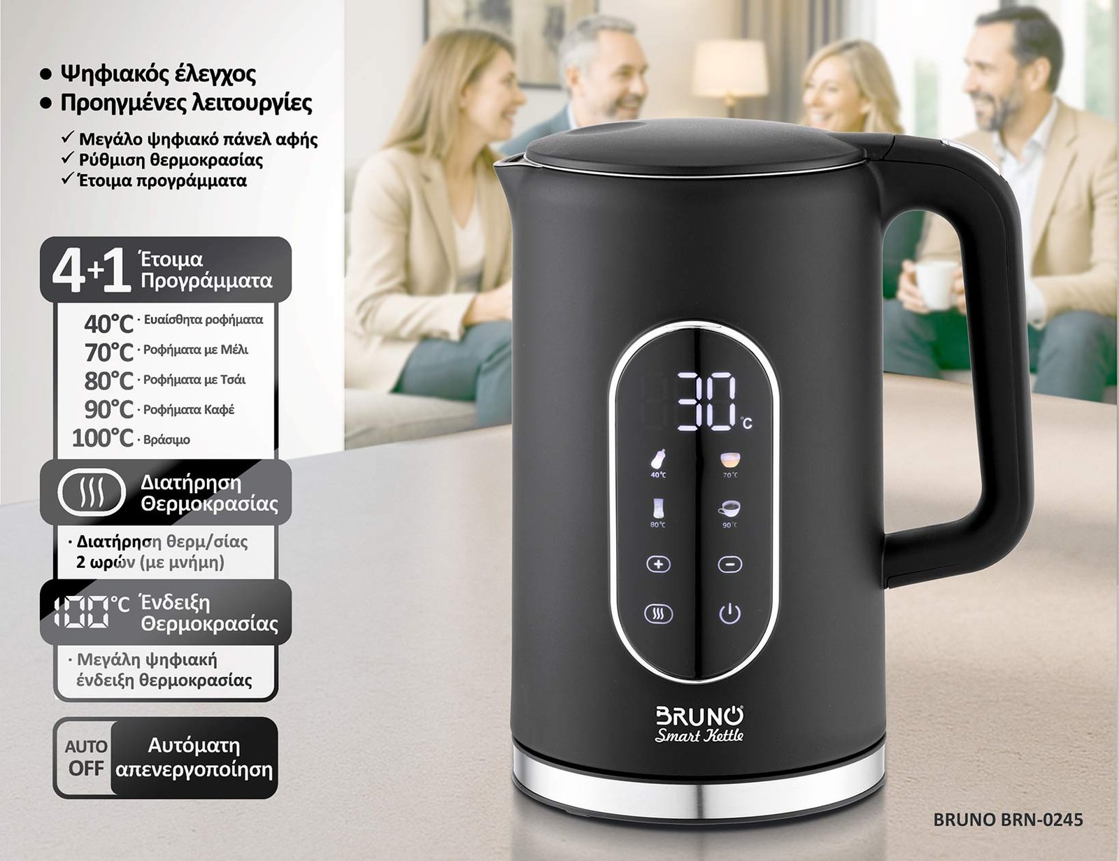 BRUNO βραστήρας νερού προηγμένων λειτουργιών BRN-0245, ψηφιακός, με διπλό τοίχωμα, 1.7L, 2200W, μαύρος