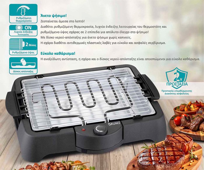 Ζεσταίνεται άμεσα στο λεπτό! Διαθέτει ρυθμιζόμενη θερμοκρασία, λυχνία ένδειξης λειτουργίας του θερμοστάτη και ρυθμιζόμενο ύψος σχάρας σε 2 επίπεδα για απόλυτο έλεγχο στο ψήσιμο! Με δίσκο νερού-απόσταξης για άνετο ψήσιμο χωρίς καπνούς.