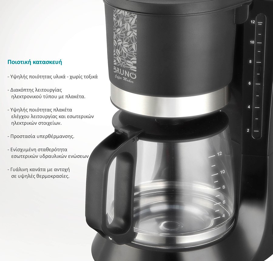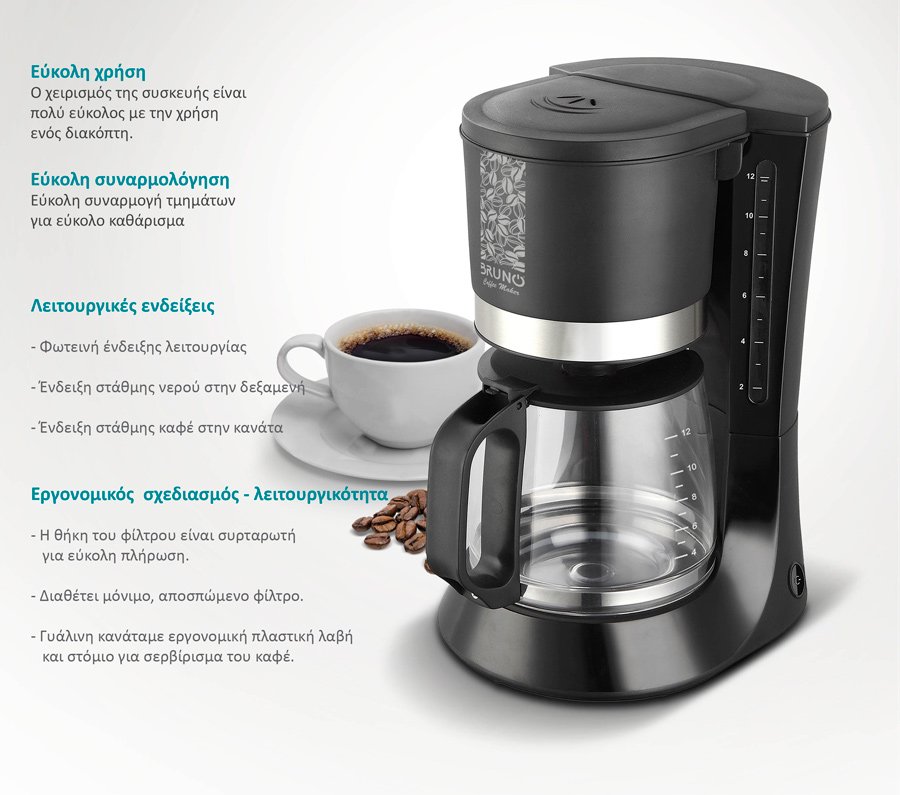 Καφετιέρα φίλτρου εξαιρετικής απόδοσης της Bruno με ισχύ 680W και χωρητικότητα 1,2lt.