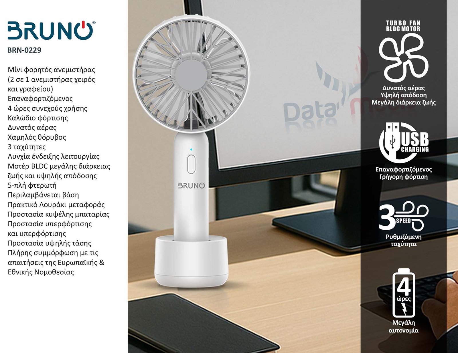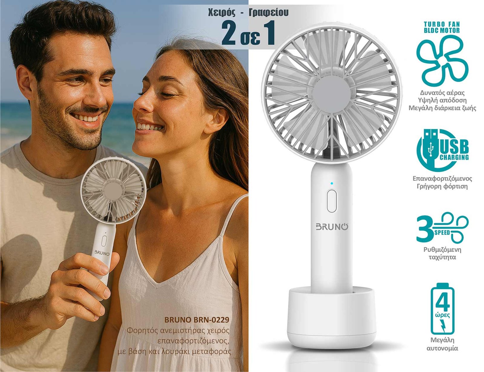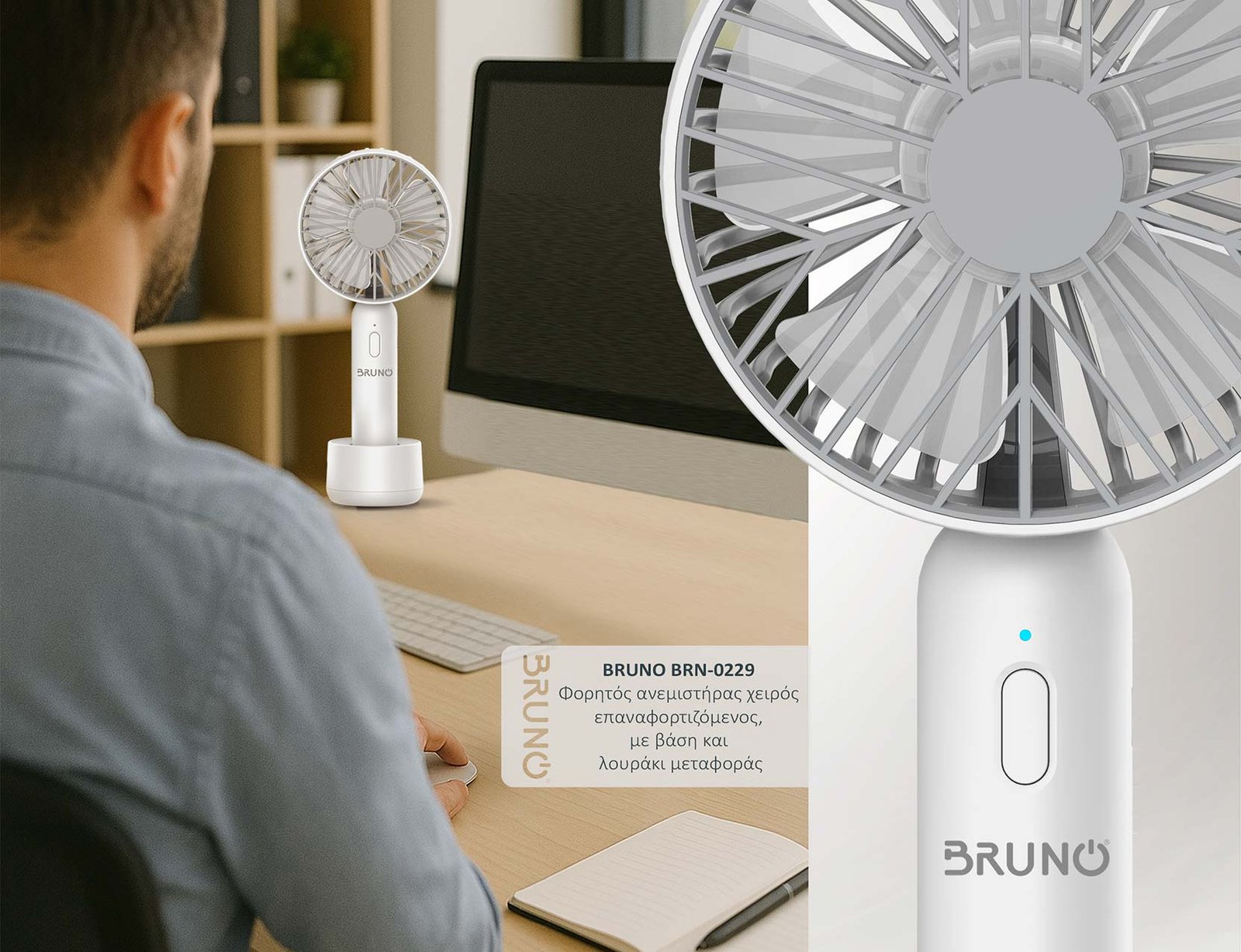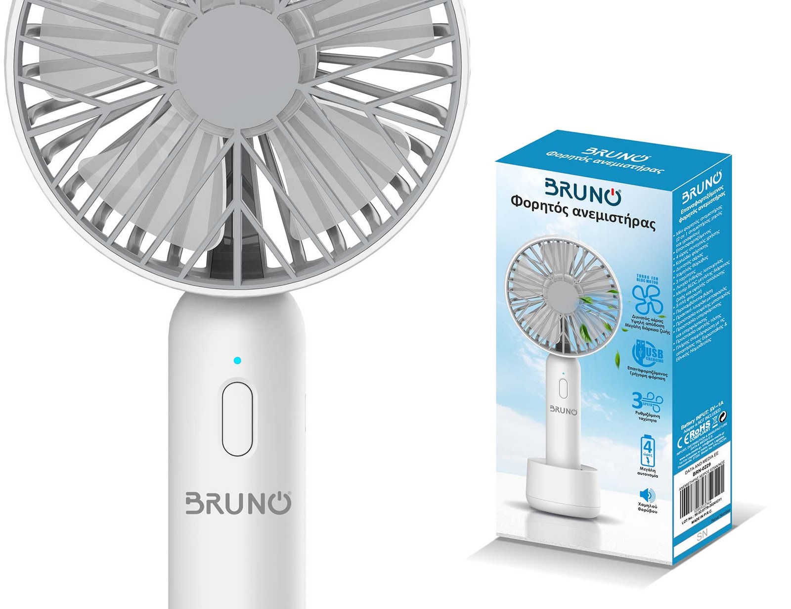 BRUNO φορητός ανεμιστήρας χειρός BRN-0229, επαναφορτιζόμενος, με βάση & λουράκι μεταφοράς, λευκός/γκρι
