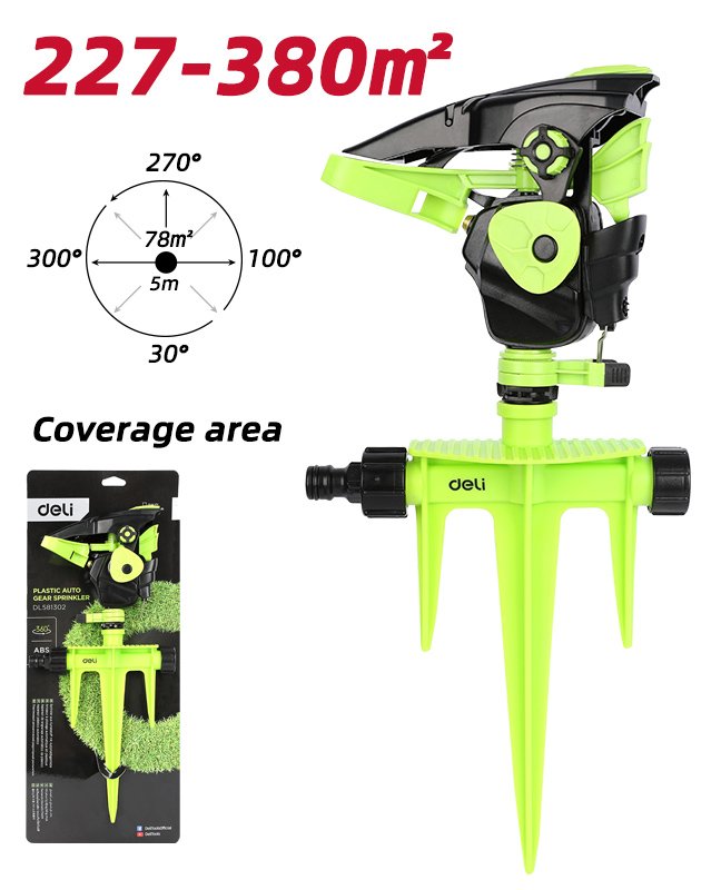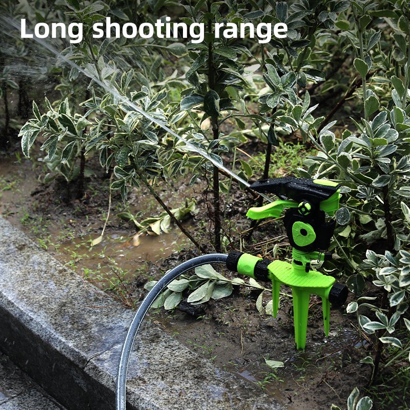 Διαθέτει καρφωτή βάση για εύκολη και σταθερή τοποθέτηση στο έδαφος και δυνατότητα 360° ρύθμισης γωνίας ρίψης, καλύπτοντας ομοιόμορφα μεγάλες επιφάνειες.