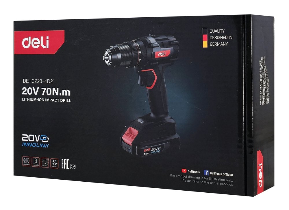 DELI κρουστικό δραπανοκατσάβιδο μπαταρίας DE-CZ20-1D2, Brushless, 20V, 2x 2Ah, 70N.m