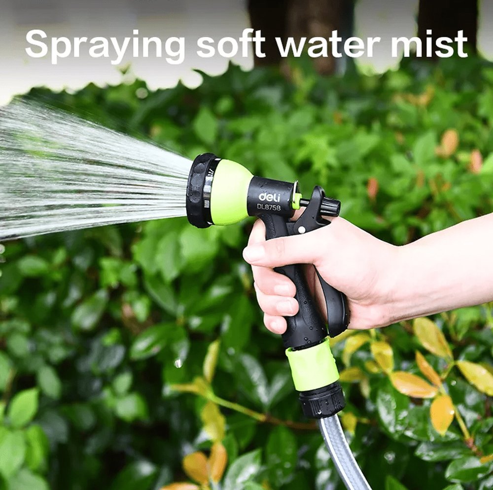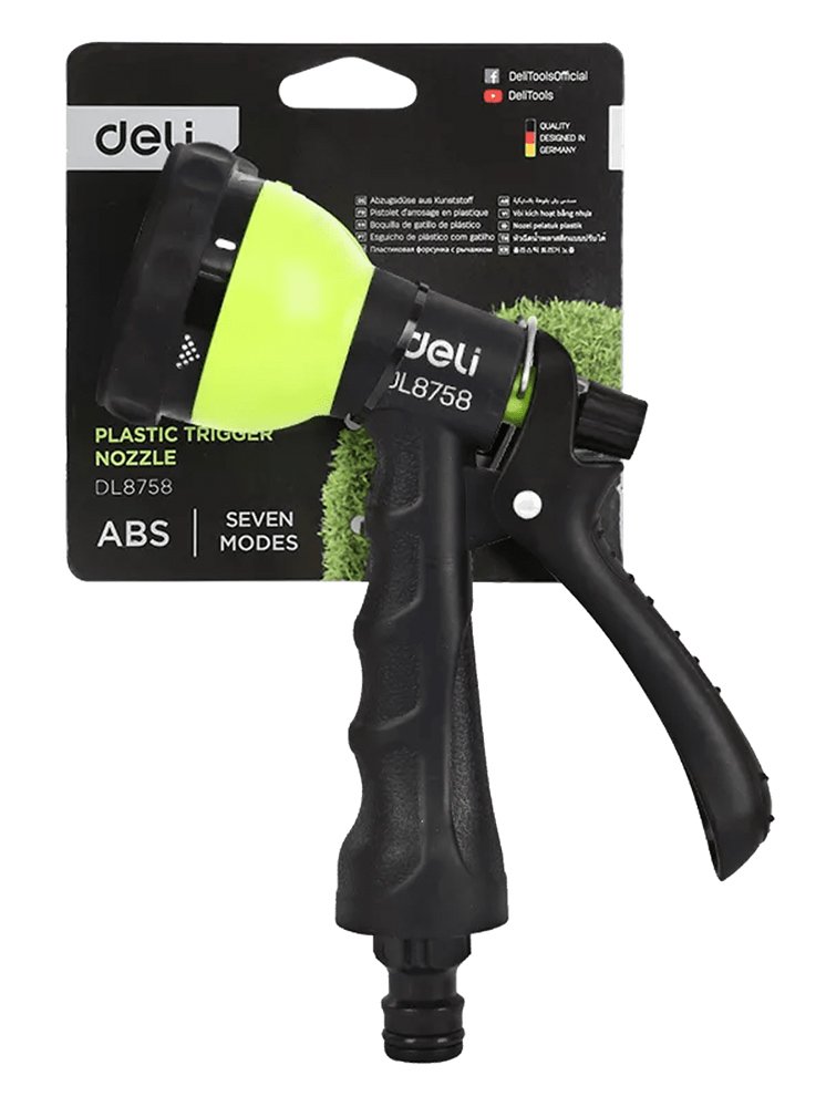 Πιστόλι εκτόξευσης νερού της Deli με 7 λειτουργίες ψεκασμού. Διαθέτει αντιολισθητική λαβή που εφαρμόζει καλά στο χέρι για πιο ξεκούραστο πότισμα.