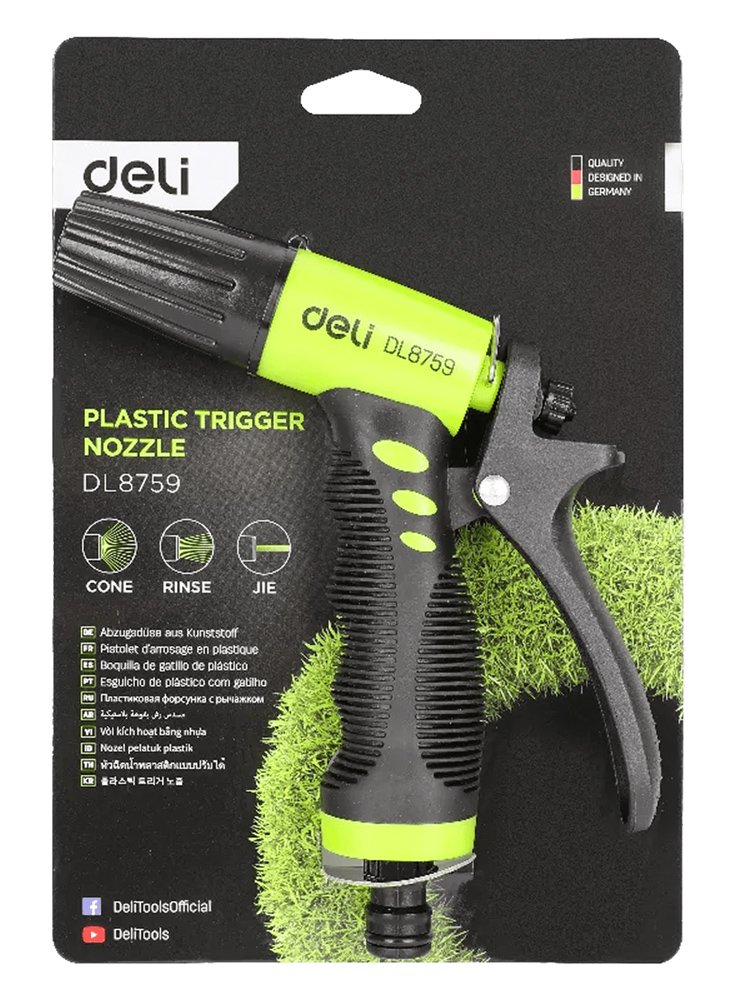Πιστόλι εκτόξευσης νερού της Deli με 3 λειτουργίες ψεκασμού. Διαθέτει αντιολισθητική λαβή που εφαρμόζει καλά στο χέρι για πιο ξεκούραστο πότισμα.