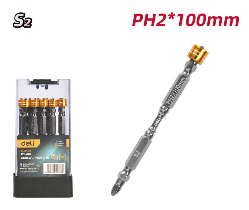 DELI σετ μύτες κατσαβιδιού DL255100 για δραπανοκατσάβιδο, διπλή κεφαλή, PH2x100mm, με μαγνητικό ring, 10τμχ