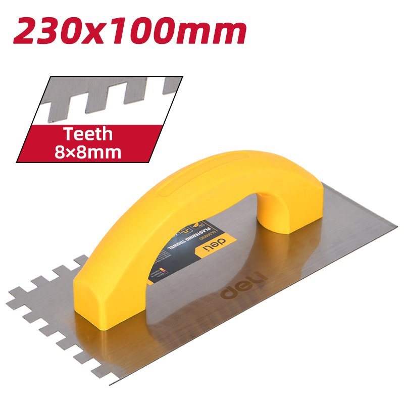 Σπάτουλα πλακιδίων της DELI με ανθεκτική λάμα από χάλυβα άνθρακα και πλαστική λαβή. Είναι ιδανική για εργασίες σοβατίσματος και ομοιόμορφη εφαρμογή κόλλας πλακιδίων σε δάπεδα και τοίχους.