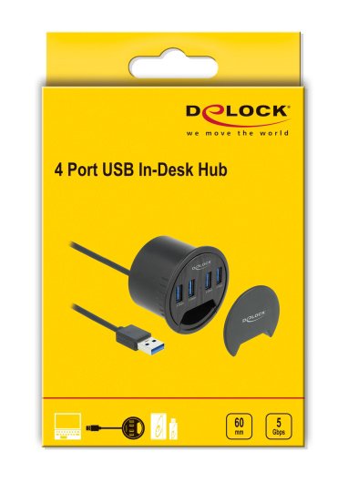 Αυτό το USB hub της Delock μπορεί να τοποθετηθεί σε μια υπάρχουσα εγκοπή στο γραφείο σας και να συνδεθεί με τον υπολογιστή σας μέσω θύρας USB για να επεκτείνει τις θύρες του με 4x USB 3.2 θύρες.