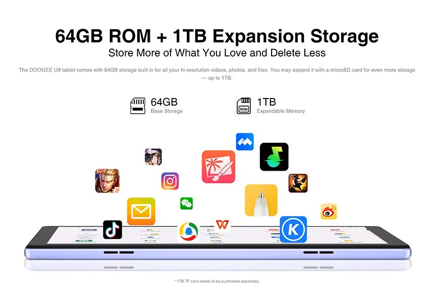 Με 3GB (+4GB virtual) RAM και 64GB ROM για να αποθηκεύετε τα αγαπημένα σας αρχεία, φωτογραφίες και βίντεο. Επιπλέον, προσφέρει την δυνατότητα να επεκτείνετε τον χώρο αποθήκευσης του tablet με κάρτα micro SD έως 1TB.