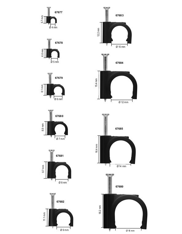 Ρόκα ιδανικά για την στήριξη καλωδίων σε τοίχους, κουφώματα θυρών και γωνίες. Είναι κατασκευασμένα από υψηλής ποιότητας πλαστικό με γαλβανισμένα ατσάλινα καρφιά. Μπορούν να χρησιμοποιηθούν τόσο σε εσωτερικούς όσο και εξωτερικούς χώρους. Η συσκευασία περιλαμβάνει 100 τεμάχια, τοποθετημένα μέσα σε βολικό πλαστικό κουτί αποθήκευσης.