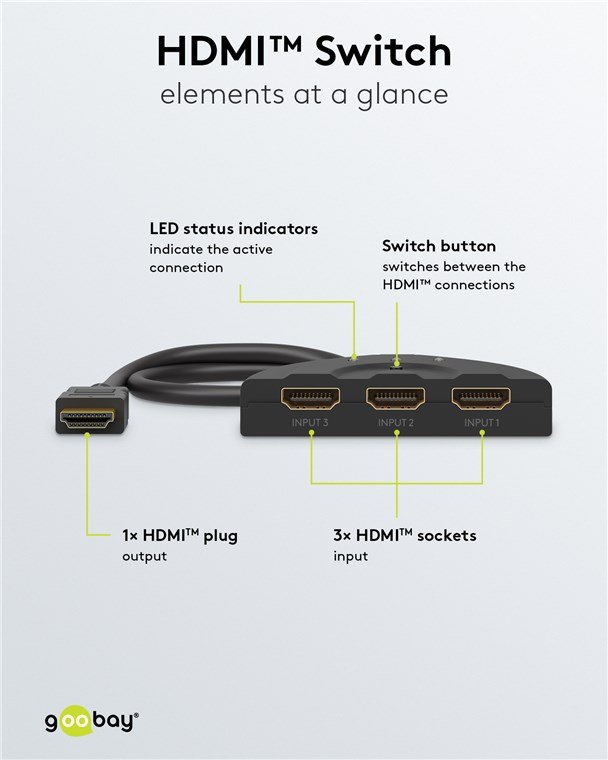 Το HDMI switch της Goobay σας επιτρέπει την εύκολη εναλλαγή μεταξύ 3x συσκευών εισόδου όπως PC ή gaming κονσόλες σε 1x συσκευή εξόδου όπως οθόνη ή τηλεόραση. Η εναλλαγή γίνεται μέσω πλήκτρου.