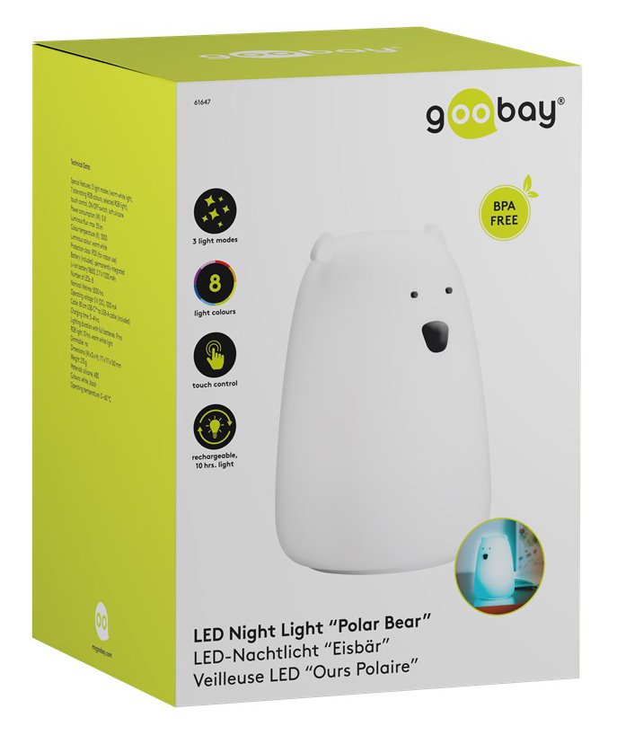 Χαρίστε στο παιδικό δωμάτιο μια ζεστή και χαλαρωτική ατμόσφαιρα με το LED φωτιστικό νυκτός της Goobay σε σχήμα χαριτωμένης πολικής αρκούδας.