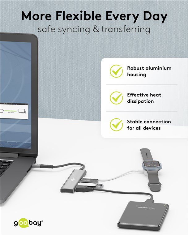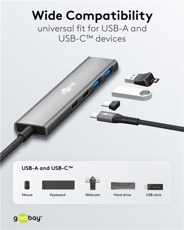 Αυτό το hub της Goobay μπορεί να συνδεθεί με το laptop ή το desktop σας μέσω θύρας USB-C και να επεκτείνει τις θύρες του με 2x USB και 2x USB-C θύρες. Διαφορετικές συσκευές USB, όπως εξωτερικοί σκληροί δίσκοι, card readers, ποντίκια κλπ. μπορούν να συνδεθούν μέσω του hub.