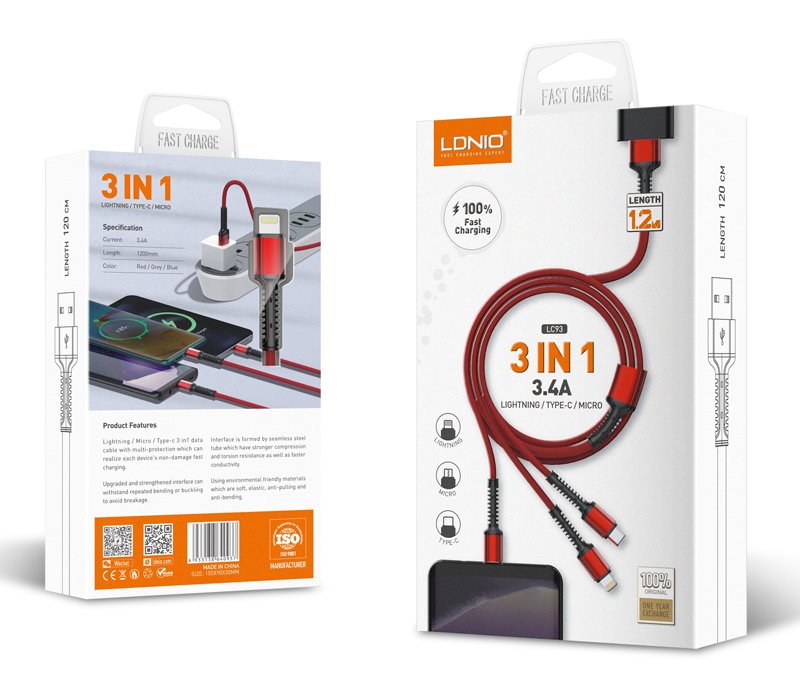 LDNIO καλώδιο USB σε USB-C/Lightning/Micro USB LC93, 3.4A, 1.2m, γκρι