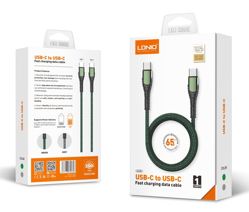 LDNIO καλώδιο USB-C σε USB-C LC101, 65W PD, 1m, γκρι