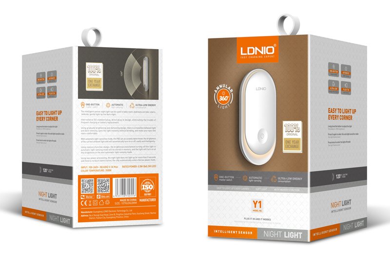 Φωτιστικό νυκτός της LDNIO με αισθητήρα φωτός για την αυτόματη ενεργοποίηση του φωτιστικού όταν βραδιάζει. Διαθέτει πολυλειτουργικό διακόπτη για την ρύθμιση της φωτεινότητας και εναλλαγή λειτουργίας (light sensitive mode, light off mode).