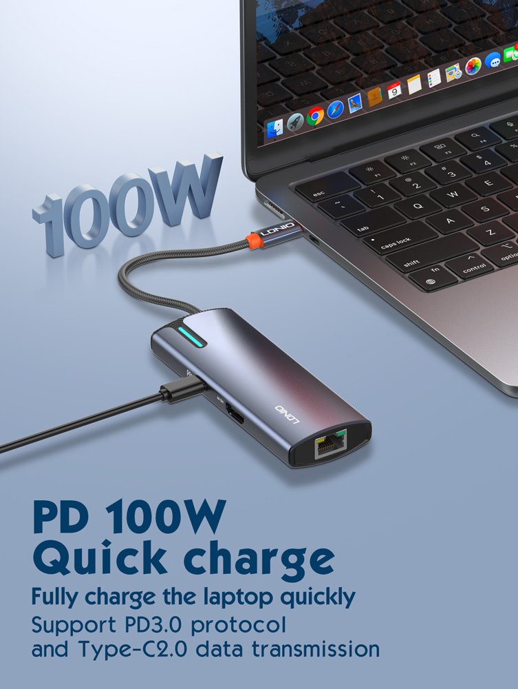 Μέσω της θύρας USB-C PD μπορείτε να φορτίσετε το laptop σας με απόδοση έως 100W ενώ μέσω της θύρας HDMI σας επιτρέπει την σύνδεση οθόνης με ανάλυση έως 4K. Επιπλέον, εξοπλίζεται με θύρα RJ45 για ενσύρματη σύνδεση στο δίκτυο με ταχύτητες έως 1000Mbps.
