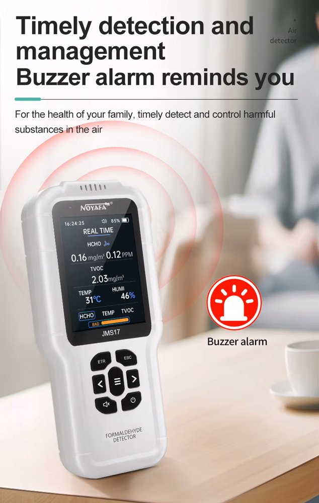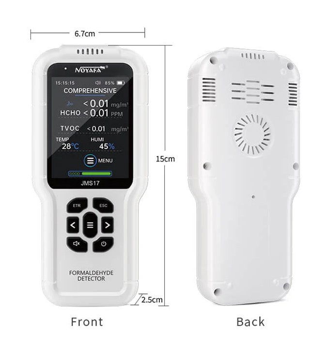 Το JMS17 είναι ένα χρήσιμο εργαλείο που μπορεί να μετρήσει ταυτόχρονα την ποιότητα του αέρα (μετρώντας τη συγκέντρωση της φορμαλδεΰδης και της οργανικής ύλης), τη θερμοκρασία και την υγρασία περιβάλλοντος.