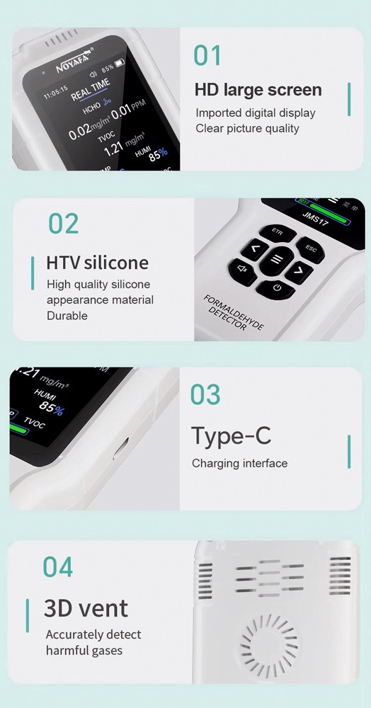 -Real-time measurement: HCHO (mg/m3 PPM), TVOC (mg/m3), temperature (°C) and humidity (%)