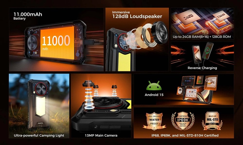 OUKITEL smartphone WP53 με ηχείο 3W, 6.52", 8/128GB, 11000mAh, IP68/IP69K/MIL-STD-810H, μαύρο