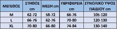 ΠΡΟΣΟΧΗ: Μετρήστε το παιδί και βρείτε το κατάλληλο μέγεθος από την παρακάτω ταμπέλα. Οι διαστάσεις στη παρακάτω ταμπέλα είναι οι πραγματικές διαστάσεις του ρούχου. Μετρώντας βλέπετε στη ταμπέλα ποιο μέγεθος ταιριάζει καλύτερα, δηλαδή πού θα φτάσει το ρούχο.