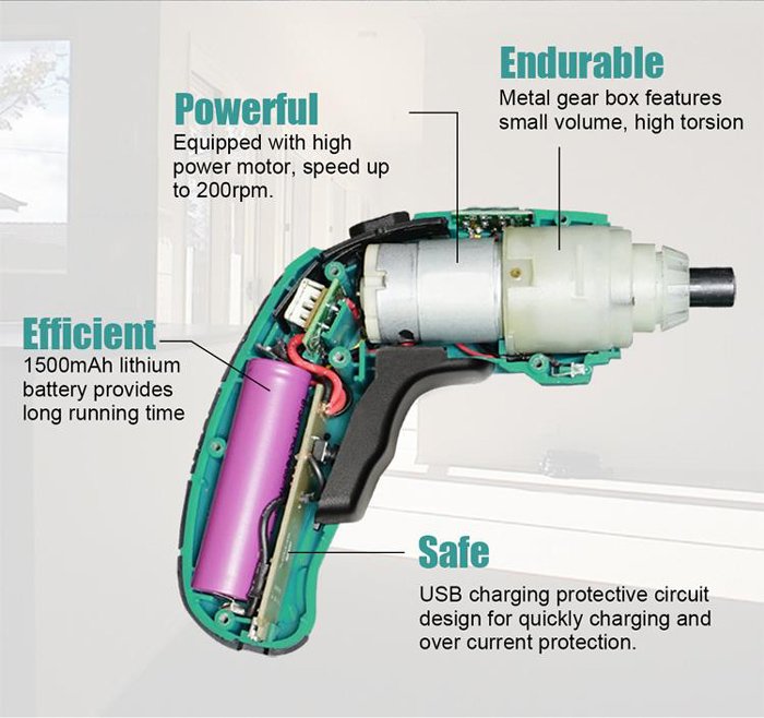 Στη συσκευασία συμπεριλαμβάνονται 4 μύτες κατσαβιδιού και καλώδιο φόρτισης.