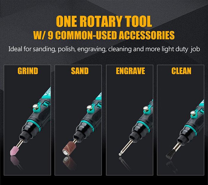 Μίνι περιστροφικό πολυεργαλείο της PROSKIT, κατάλληλο για λείανση, τρίψιμο, χάραγμα & καθαρισμό διαφόρων επιφανειών.