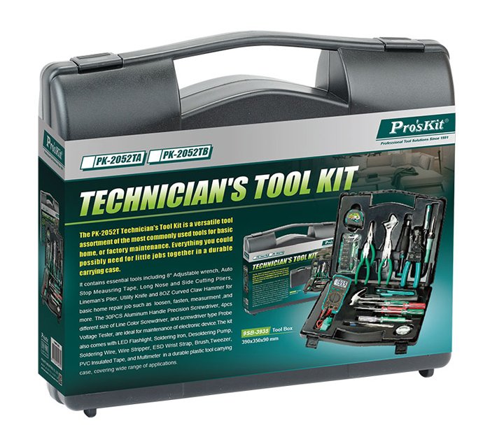 Σετ εργαλείων της PROSKIT το οποίο αποτελείται από εργαλεία και εξαρτήματα, κατάλληλα για τεχνικές εργασίες.