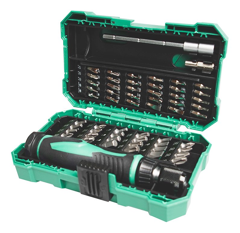 Σετ της PROSKIT το οποίο αποτελείται από 1 κατσαβίδι, 1 αντάπτορα επέκτασης, 1 αντάπτορα 1/4" σε 4mm και 54 διαφορετικές μύτες κατσαβιδιού.