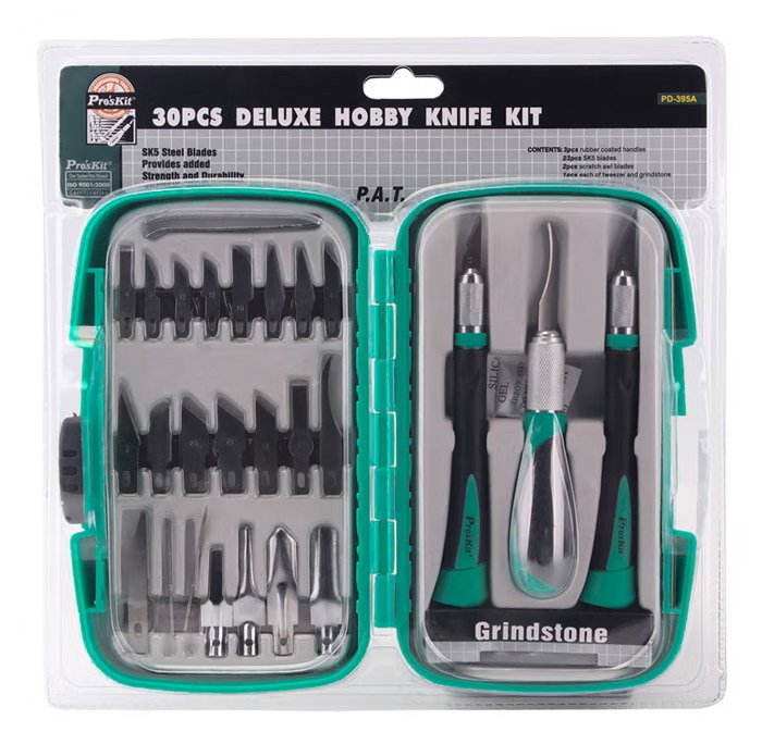 Σετ της PROSKIT το οποίο αποτελείται από 3 κοπίδια ακριβείας, 25 λεπίδες, 1 τσιμπίδα και 1 πέτρα ακονίσματος.