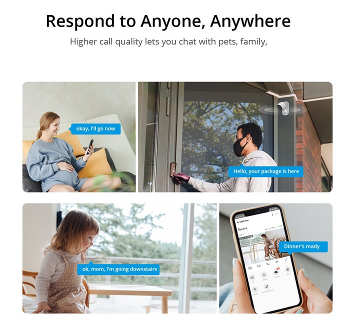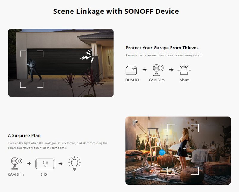 Ο έλεγχος της γίνεται απομακρυσμένα από smartphone μέσω Wi-Fi και της εφαρμογής eWeLink. Μπορεί να εντοπίζει ανθρώπινη σιλουέτα και κίνηση και να ειδοποιήσει τον ιδιοκτήτη με push notifications απευθείας στο smartphone αλλά και να ενεργοποιεί ηχητικό συναγερμό.
