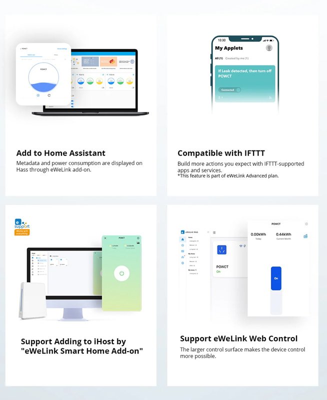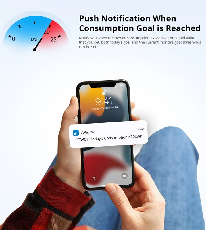 Συνδέεται μέσω WiFi και της εφαρμογής eWeLink με το smartphone σας, επιτρέποντας σας να παρακολουθείτε το ρεύμα που καταναλώνουν οι συσκευές σας και να υπολογίσετε το κόστος λειτουργίας τους. Μπορείτε να παρακολουθείτε την ακριβή τάση και ισχύ σε πραγματικό χρόνο, να προγραμματίσετε την αυτόματη ενεργοποίηση και απενεργοποίηση των συσκευών σας σε καθορισμένο χρόνο, άλλα και να ορίσετε τιμές κατώτατου ορίου για το ρεύμα, την τάση και την ισχύ ώστε να προστατεύσετε τις συσκευές σας από την υπερφόρτωση.