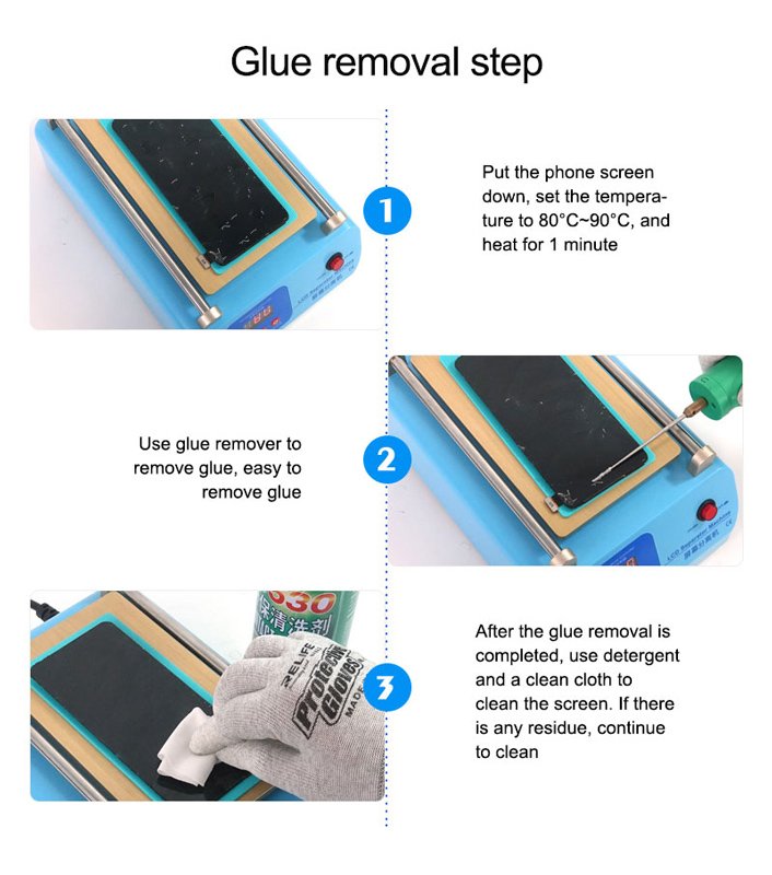 Μηχάνημα διαχωρισμού LCD οθόνης smartphone από την Sunshine. Διαθέτει θερμοστάτη για την ρύθμιση της θερμοκρασίας και οθόνη για την παρακολούθηση της σε πραγματικό χρόνο. Υιοθετεί την τεχνική του κενού αέρα, μέσω της αντλίας που έχει, κάτι το οποίο κάνει πιο εύκολη την χρήση του καθότι δεν χρησιμοποιεί σφιγκτήρες για την σταθεροποίηση της οθόνης και την αφαίρεση της.