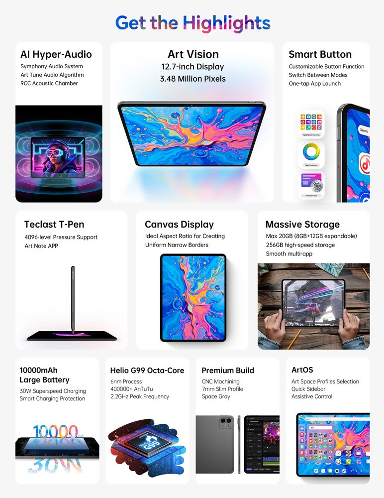 Το tablet ArtPad Pro της Teclast συνδυάζει εντυπωσιακές επιδόσεις και εκλεπτυσμένο σχεδιασμό. Με μεγάλη οθόνη 12.7", ευέλικτο σύστημα λειτουργικού Android 15 και ισχυρό οκταπύρηνο επεξεργαστή, το ArtPad Pro προσφέρει υψηλή απόδοση, για δημιουργία σχεδίων, απρόσκοπτη περιήγηση στο διαδίκτυο, παιχνίδια, πολυμέσα και πολλά άλλα.