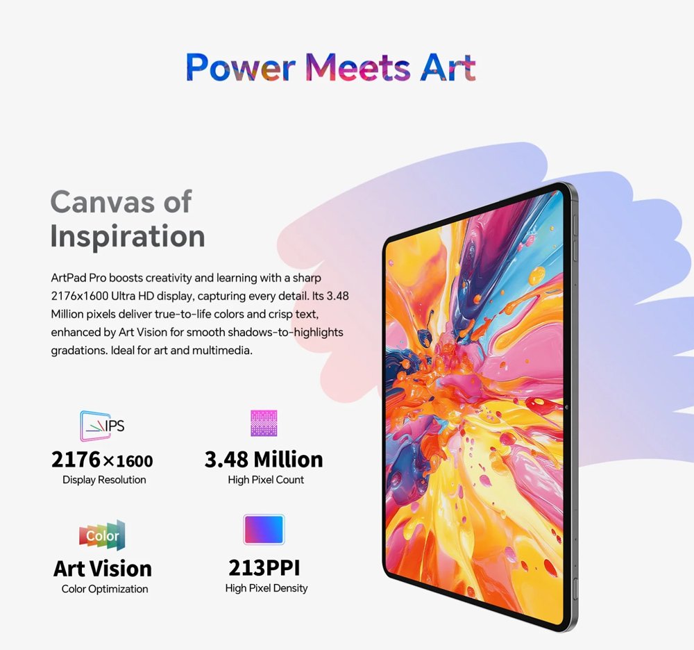 Εξοπλισμένο με επεξεργαστή 8 πυρήνων και λειτουργικό Android 15, το ArtPad Pro προσφέρει υψηλή απόδοση για απρόσκοπτη περιήγηση στο διαδίκτυο, παιχνίδια, πολυμέσα και πολλά άλλα.