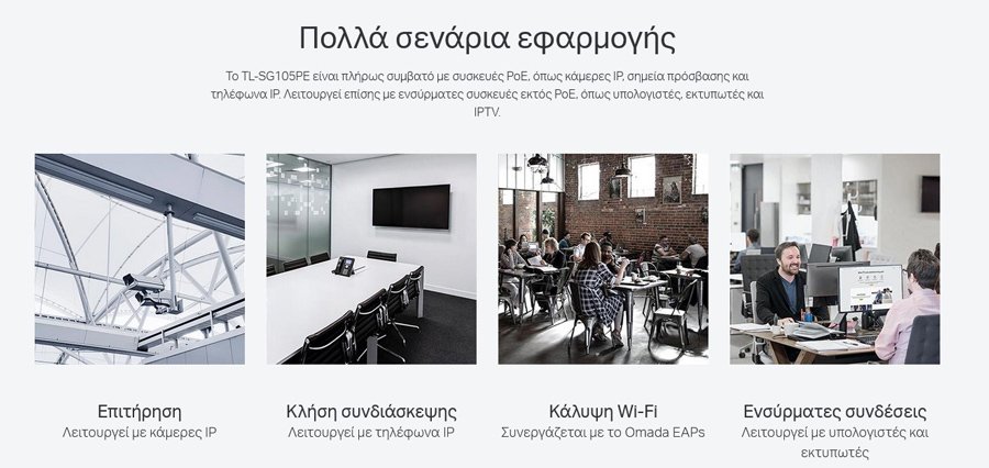 Το TL-SG105PE είναι ένα επαγγελματικό Gigabit Easy Smart Switch 5-θυρών με PoE + 4 θυρών, πλήρως συμβατό με συσκευές PoE, όπως κάμερες IP, σημεία πρόσβασης και τηλέφωνα IP. Λειτουργεί επίσης με ενσύρματες συσκευές εκτός PoE, όπως υπολογιστές, εκτυπωτές και IPTV.