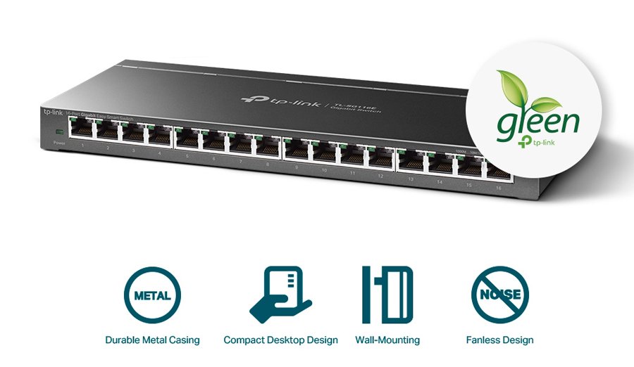 Το Easy Smart Switch της TP-LINK είναι η ιδανική επιλογή για να επεκτείνετε τις θύρες δικτύου Gigabit, στο σπίτι ή το γραφείο, με 16 θύρες RJ45 με ταχύτητα 10/100/1000Mbps.