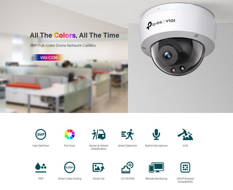 Δικτυακή κάμερα της TP-LINK με φακό 2.8mm και αισθητήρα ανάλυσης 3MP. Υποστηρίζει έγχρωμη νυχτερινή όραση, τροφοδοσία PoE και εξοπλίζεται με εσωτερικό μικρόφωνο για μεταφορά ήχου.