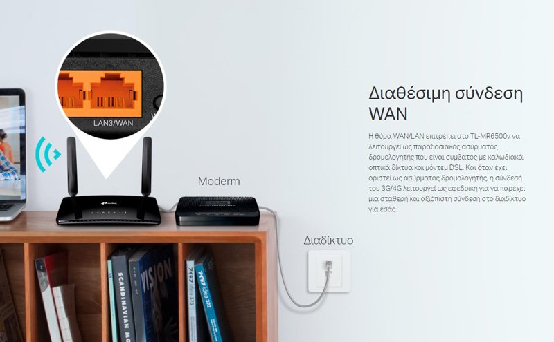 Η διαθέσιμη θύρα WAN/LAN επιτρέπει στο TL-MR6500V να λειτουργεί ως παραδοσιακό ασύρματο router που είναι συμβατό με καλώδια, ίνες και μόντεμ DSL, παρέχοντας γρήγορες και σταθερές συνδέσεις Wi-Fi με ταχύτητες έως 300 Mbps.