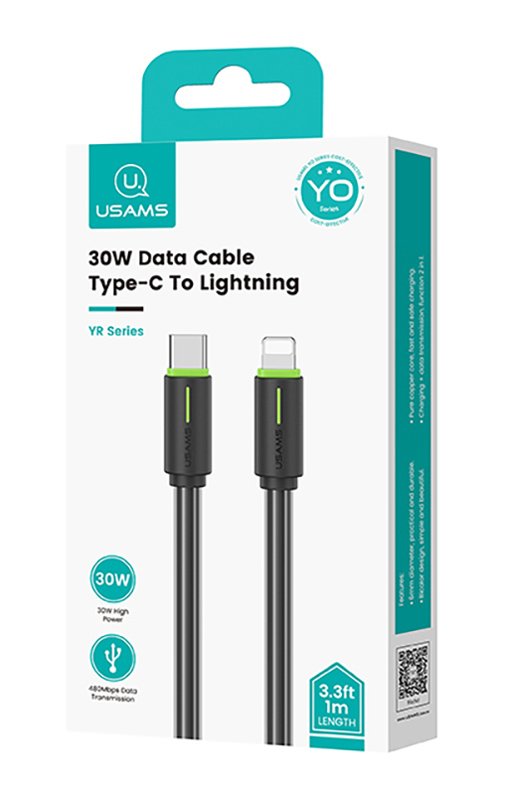 Καλώδιο φόρτισης και μεταφοράς δεδομένων Lightning σε USB-C της Usams. Υποστηρίζει φόρτιση με απόδοση έως 30W και μεταφορά δεδομένων με ταχύτητα έως 480Mbps.