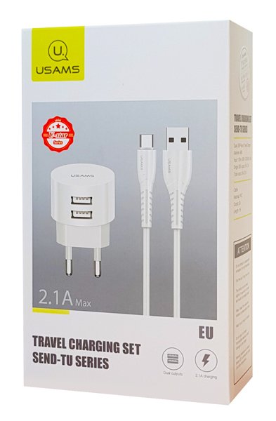 USAMS φορτιστής τοίχου T20 & καλώδιο type-C, 2x USB, 2.1A, λευκός