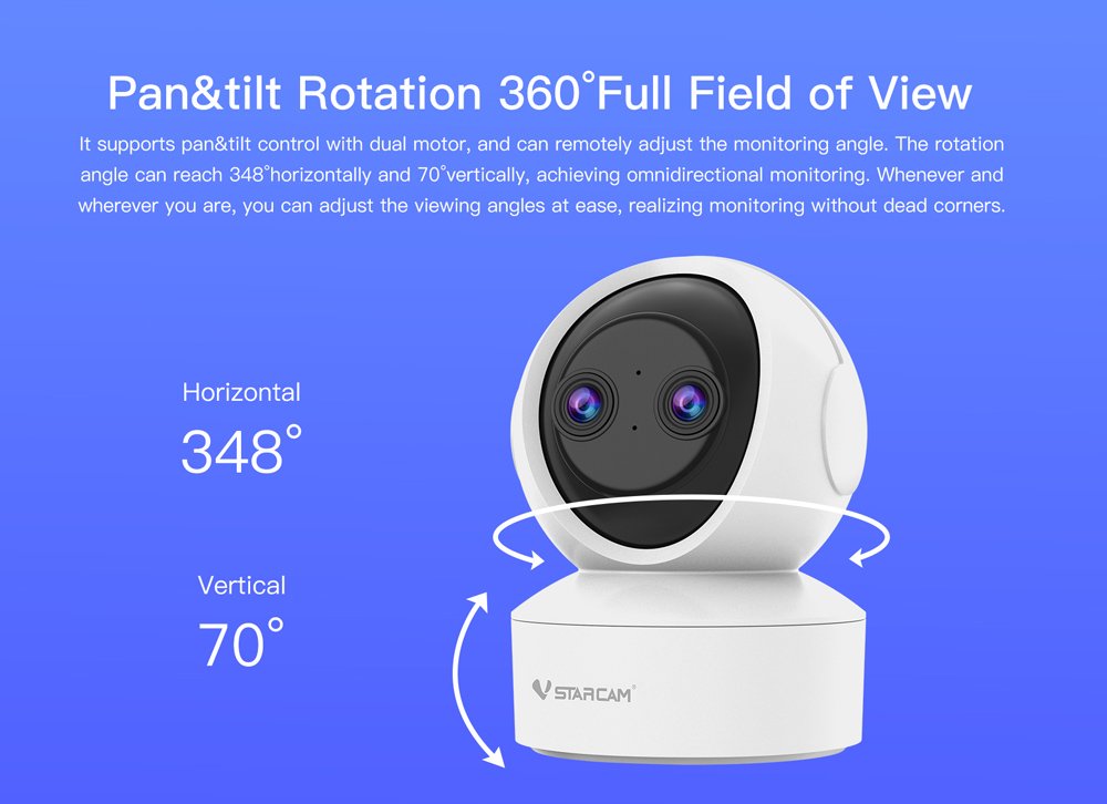 -Pan & Tilt: Rotation angle: Horizontal 348°/Vertical 70° (visible angle 360°)