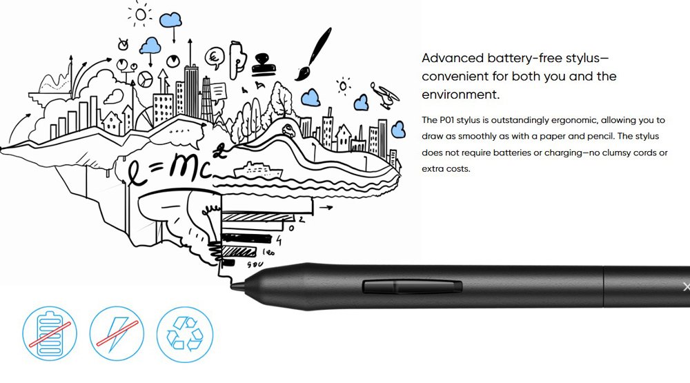 Η σύνδεση του με desktop ή laptop γίνεται μέσω καλωδίου USB, ενώ, στη συσκευασία συμπεριλαμβάνεται γραφίδα η οποία λειτουργεί χωρίς μπαταρία.